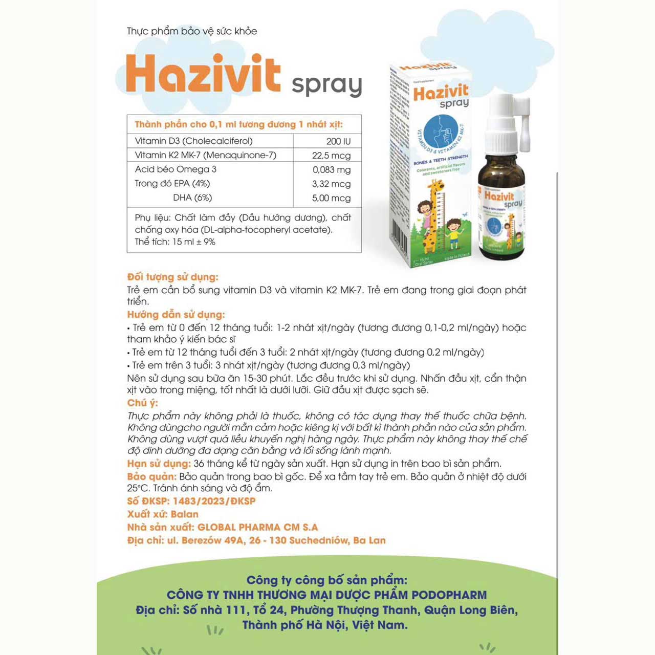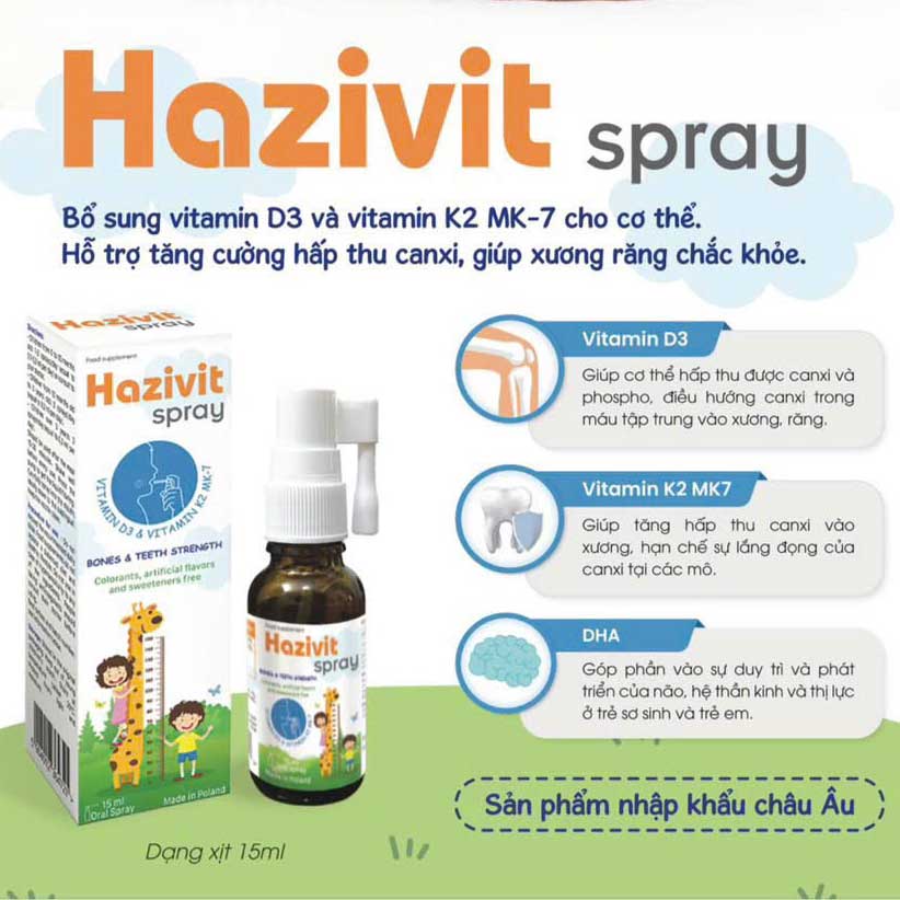Hazivit spray là sản phẩm giúp bổ sung vitamin D3 và vitamin K2 MK-7, hỗ trợ tăng cường hấp thu canxi, giúp xương răng chắc khỏe. Đối tượng sử dụng sản phẩm là trẻ đang trong giai đoạn phát triển và cần bổ sung các vitamin cần thiết giúp chắc khỏe xương răng. Sản phẩm được nhập khẩu từ Ba Lan do công ty GLOBAL PHARMA CM S.A sản xuất.